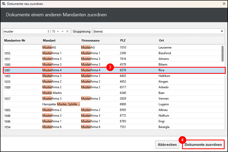 Es kann vorkommen, dass ein Mandant doppelt angelegt wurde. Um diese Mandanten zu konsolidieren, können Dokumente von einem Mandanten in einen anderen übertragen werden. Gehen Sie dazu wie folgt vor: