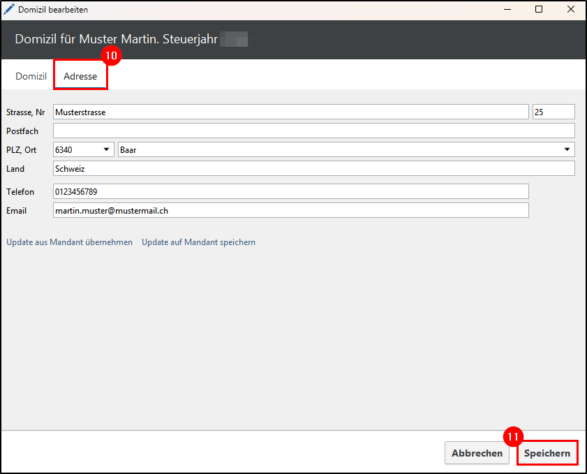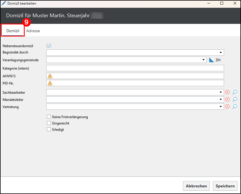 - Klicken Sie auf Domizil und erfassen Sie die entsprechenden Angaben.